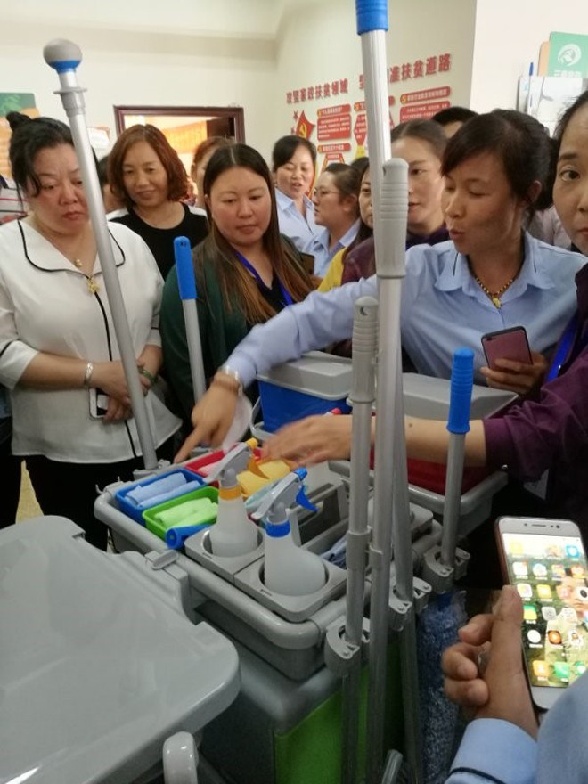 來賓們體驗(yàn)日常保潔工具(除塵、濕擦、拖地、垃圾收集等專項(xiàng))的搭配及使用。