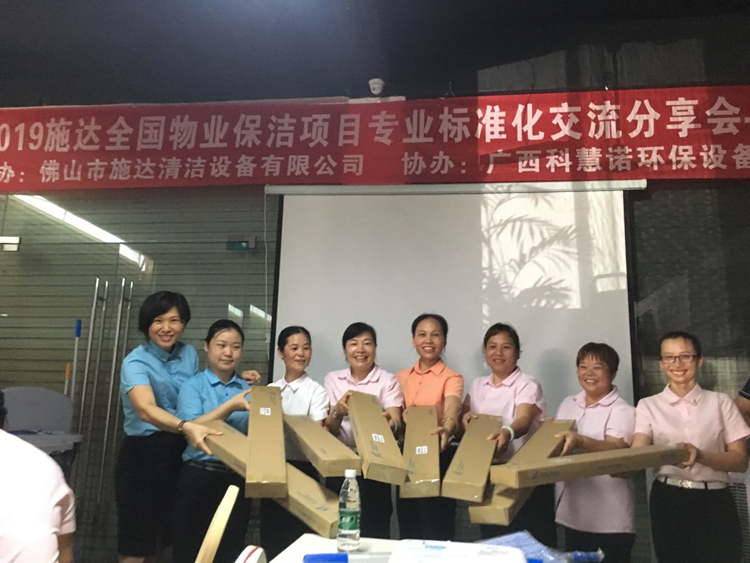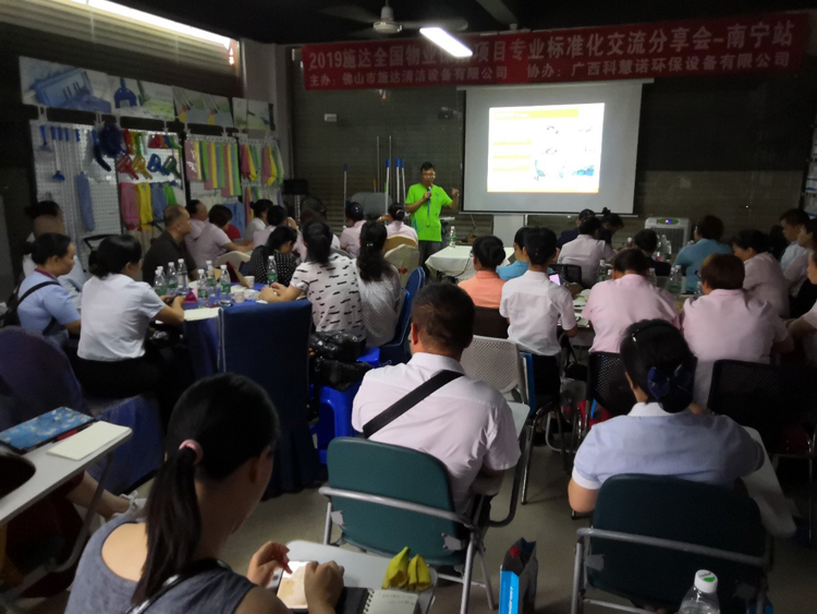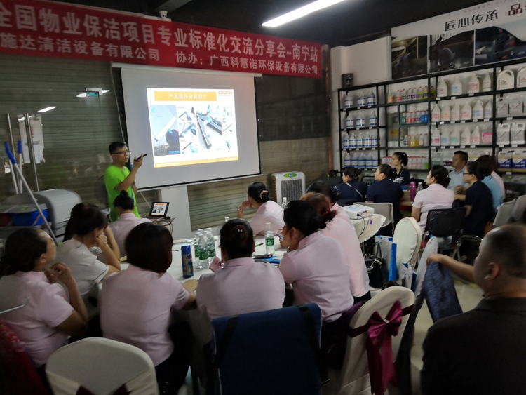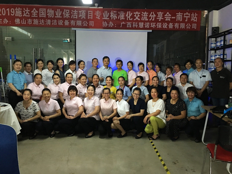 2019年6月13日,本次交流會來到了南寧。在施達南寧地區(qū)經(jīng)銷商:廣西科慧諾環(huán)保設(shè)備有限公司的協(xié)助下,誠邀各物業(yè)管理人員齊聚一堂,圍繞預(yù)防管理——感控管理——模塊化管理——營運體系(培訓(xùn)、考核體系),共同探討保潔行業(yè)的現(xiàn)狀及未來發(fā)展方向。