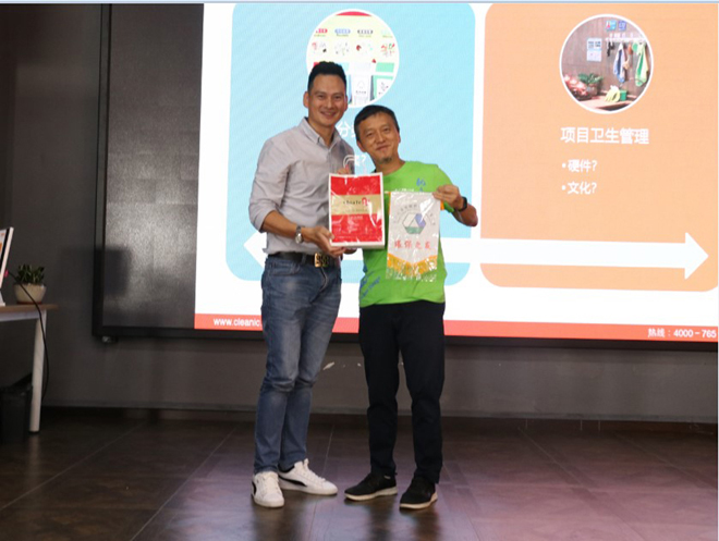 臺(tái)北市清潔服務(wù)商業(yè)同業(yè)公會(huì)理事長(zhǎng)贈(zèng)送健力公司“環(huán)保之友”牌匾,以感謝健力公司為大灣區(qū)環(huán)衛(wèi)行業(yè)事業(yè)所作貢獻(xiàn)。