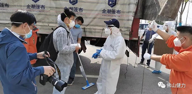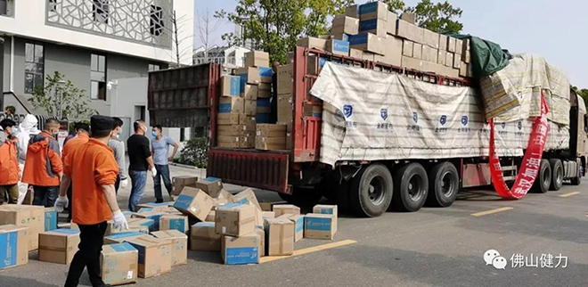 到達武漢雷神山醫(yī)院,武漢經銷商正在將物資卸車。