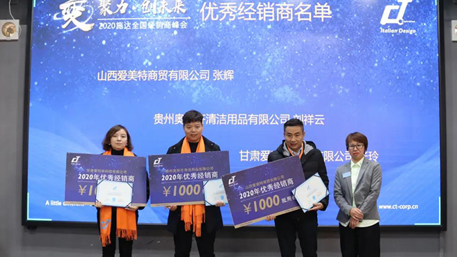 在大會頒獎環(huán)節(jié),頒獎嘉賓分別向2020有突出貢獻的施達經(jīng)銷商進行頒獎,山西愛美特商貿(mào)有限公司、貴州奧麗齊清潔用品有限公司、甘肅愛科林科技有限公司榮獲“2020施達優(yōu)秀經(jīng)銷商”稱號。