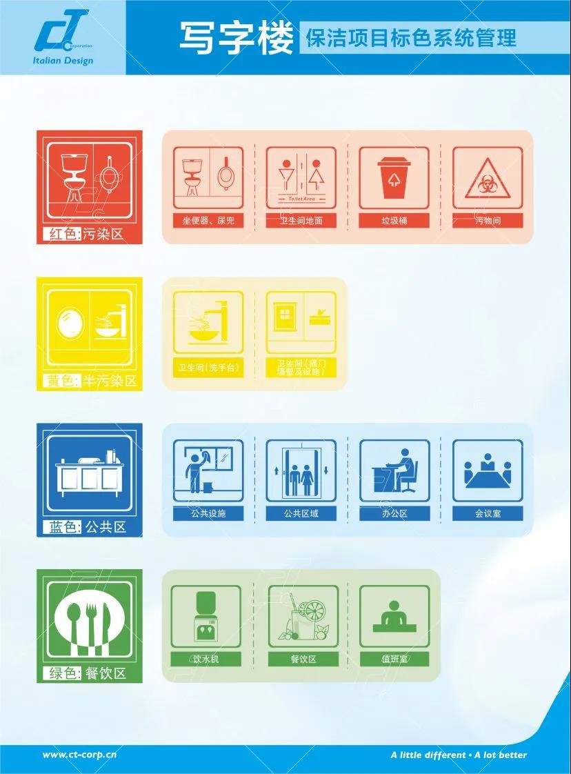 通過顏色區(qū)分,我們能夠給每個色塊定制專門的清潔方案,包括清潔工具配置、清潔流程梳理、工具的有效使用辦法、污物的清潔處理方案等。