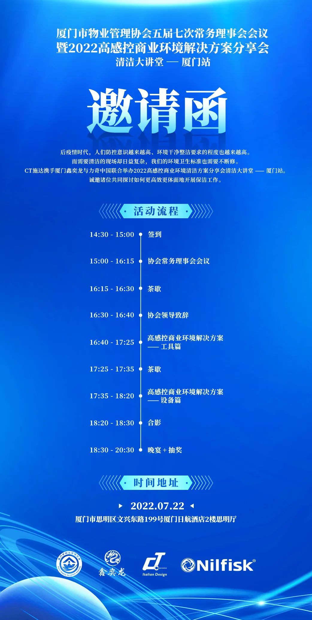 7月22日,清潔大講堂將去到廈門,由廈門鑫奕龍主辦,施達聯(lián)合力奇中國,在廈門市思明區(qū)廈門日航酒店2樓思明廳舉辦2022高感控商業(yè)環(huán)境解決方案分享會廈門站。