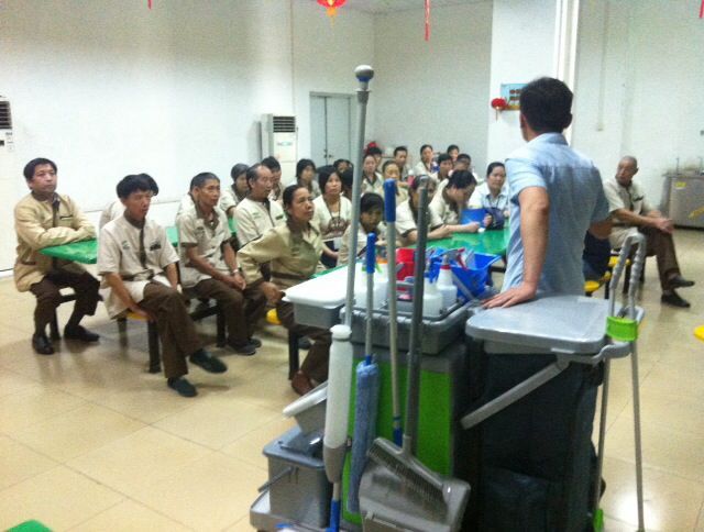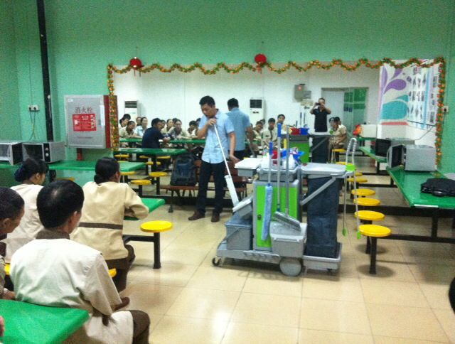 日前佛山某大型廣場全線采用CT施達(dá)噴灑平拖中央清潔系統(tǒng)及儲備箱式服務(wù)車平臺。當(dāng)天項目管理人及保潔員接受施達(dá)產(chǎn)品培訓(xùn)師的現(xiàn)場培訓(xùn)指導(dǎo),培訓(xùn)內(nèi)容包括顏色分區(qū)管理、平拖系統(tǒng)應(yīng)用以及各種工具操作。