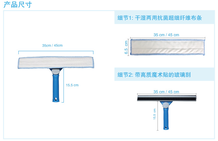 貫徹綠色環(huán)保清潔概念;膠條、魔術(shù)貼、清潔布、鋁合金條及調(diào)向手柄等各個配件均可輕松更換,同時可以匹配一桿通用的快接鋁桿,大大減低使用成本。