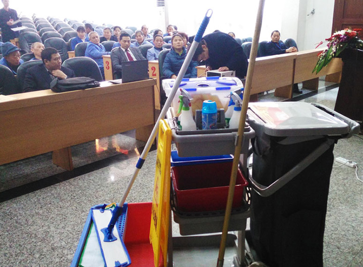 施達(dá)產(chǎn)品培訓(xùn)師為學(xué)員們講解平拖清潔系統(tǒng)的正確使用方法。