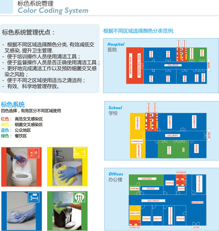 由這事件可見,現(xiàn)時普遍在職清潔服務員清潔意識薄弱,也同時反映在衛(wèi)生管理方面沒有好好定下標準而導致。其實只要加強衛(wèi)生管理的意識,便能大大提高衛(wèi)生標準。如設立標色分區(qū)管理系統(tǒng),能迅速地選擇針對不同清潔區(qū)域的清潔工具。如細菌交叉感染高危區(qū) (洗手間) 采用紅色,交叉感染敏感區(qū) (洗手盆) 使用黃色等等。此管理系統(tǒng),除了便于培訓服務員操作使用,管理人員亦能有效監(jiān)管清潔服務員是否正確使用適當?shù)那鍧嵐ぞ撸乐挂蝈e誤使用而變成傳播細菌的媒介。